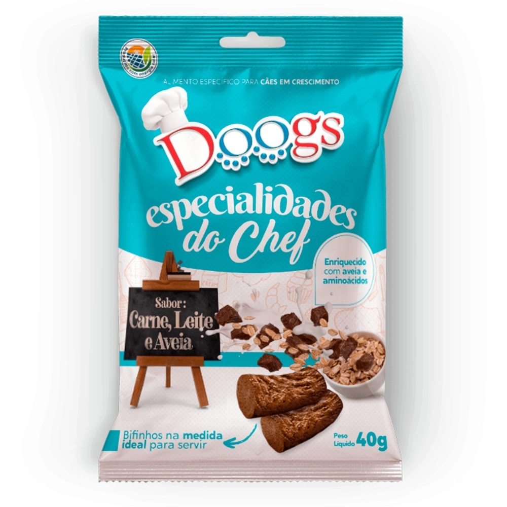 PETFOODS>CÃES>PETISCO CÃO>Doogs Bifinho Especialidades do Chefe Filhotes Carne Leite e Aveia 40g